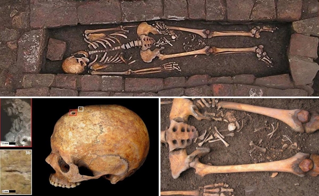 وعُثر على الهيكل العظمي للمرأة مع بقايا جنين بين فخذيها، وثقب في جمجمتها يدل على تعرضها لعلاج طبي وحشي.