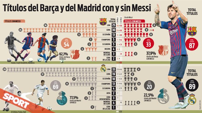 هذا ولجأت الصحافة الكتالونية وفي مقدمتها صحيفة “سبورت” إلى الأرقام من أجل التأكيد على أن ميسي كان نقطة تحول في تاريخ الناديين، موضحة بأن ريال مدريد كان متفوقاً على برشلونة في إجمالي رصيد البطولات بفارق 15 لقباً (69 للريال مقابل 54 لبرشلونة) ، ولكن بعد بزوغ نجم ميسي نجح برشلونة في رفع رصيده من الألقاب مقلصاً الفارق إلى لقبين فقط (89 للريال مقابل 87 لبرشلونة) ، وهو الفارق الذي يتجه الكتالونيون إلى كسره بعدما اقتربوا من حسم لقب الدوري الإسباني ونجحوا في بلوغ نهائي كأس الملك ، مع إمكانية تجاوزهم لأبناء العاصمة مدريد، في حال تمكنوا من إحراز لقب دوري أبطال أوروبا.