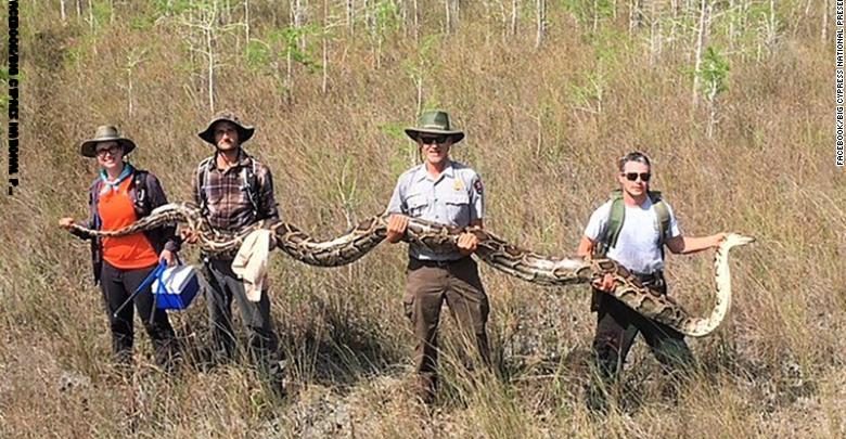 اكتشف العلماء أفعى في منتزه فلوريدا ايفرجليدز، بلغ طولها أكثر من 5 أمتار، ووزنها أكثر من 45 كليوغراماً، وتحتوي على 73 بيضة في مرحلة النمو.