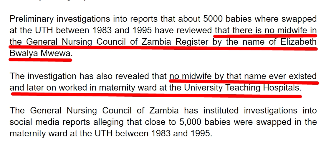 السلطات المحلية أخذت الخبر على محمل الجد، ليبدأ المجلس العام للتمريض في زامبيا تحقيقاً انتهى إلى عدم وجود ممرضة / قابلة بهذا الاسم مسجلة لديه، كما أنه لا يوجد أحد بهذا الاسم سبق وأن عمل في المستشفى المذكور.