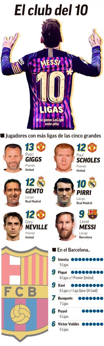 وبعد رحيل لاعب الوسط الإسباني أندريس إنييستا عن النادي الكتالوني في الموسم الماضي ، فإن تشكيلة برشلونة الحالية تضم ميسي فقط كأكثر اللاعبين إحرازاً لبطولة الدوري الإسباني بواقع 9 ألقاب ، مع الإشارة الى أن زميله المدافع الإسباني جيرارد بيكي قد توج بتسعة ألقاب في بطولة الدوري ، غير انه نال الدوري الإسباني ثماني مرات فقط مع برشلونة ، أما المرة التاسعة فقد حققها مع نادي مانشستر يونايتد عندما أحرز لقب الدوري الإنكليزي بنهاية موسم (2007-2008).