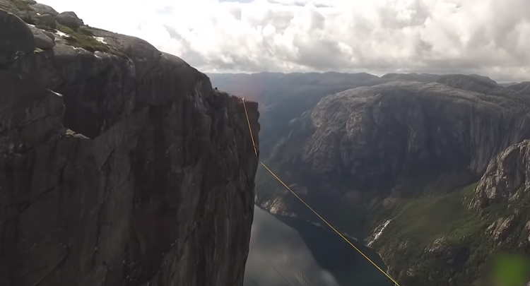 وصورت طائرة بدون طيار تحدي المغامر، إسبن هاتليسكوغ، بالكامل، حيث فقد توازنه وسقط من على الحبل المعلق، إلا أن حبل الأمان المربوط بجسده جنبه السقوط و الموت في الوادي السحيق.