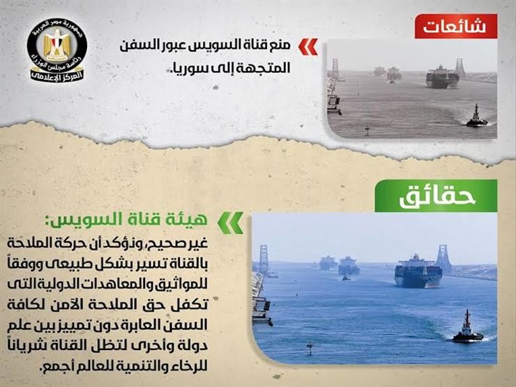 ردت الحكومة المصرية على أنباء منع السفن المتجهة إلى سوريا من عبور قناة السويس، مؤكد أنها غير صحيحة.