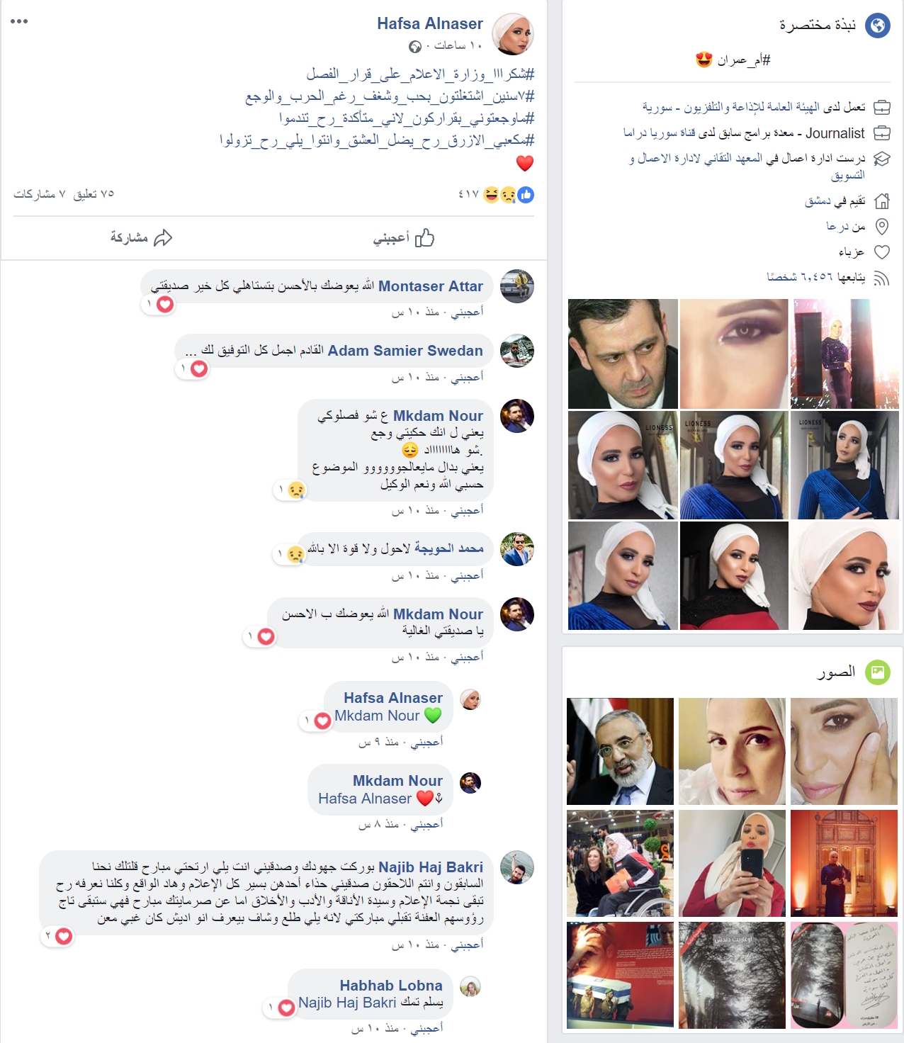 وبعد منتصف ليل الثلاثاء / الأربعاء، نشرت حفصة منشوراً جديداً أعلنت فيه أن وزارة الإعلام قامت بفصلها.