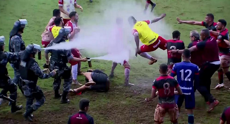 شهدت المباراة بين “أتلتيكو غويانينس” وضيفه “فيلا نوفا” في إياب نصف نهائي كأس جويانو البرازيلي مشاهد عنف دامية بين لاعبي الفريقين، مما دفع رجال حفظ النظام للتدخل للسيطرة على الوضع.