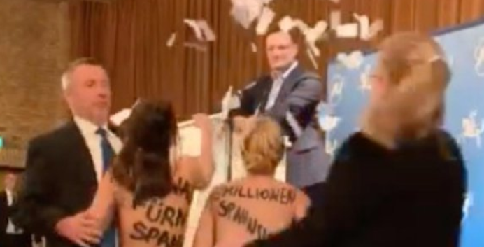 فوجئ وزير الصحة الألماني ينس شبان خلال ظهور جماهيري باثنتين من مناصرات المرأة المنتميات لحركة فيمين لذوات الصدور العارية أمامه.