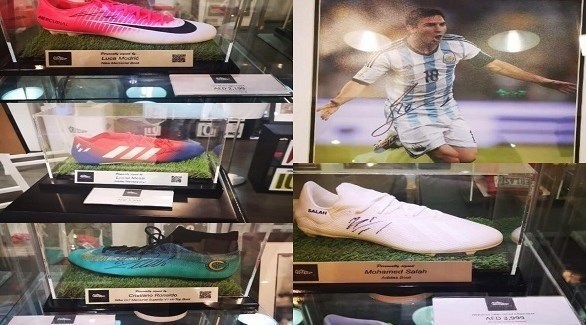 كما ويعرض المحل قميص موقع من محمد صلاح بقيمة 5 آلاف درهم ويحتوي على أحذية موقعة من لويس سواريز بـ 1999 درهم وحذاء لنيمار بـ 3299 درهم وحذاء للوكا مودريتش بـ 2199 درهما.