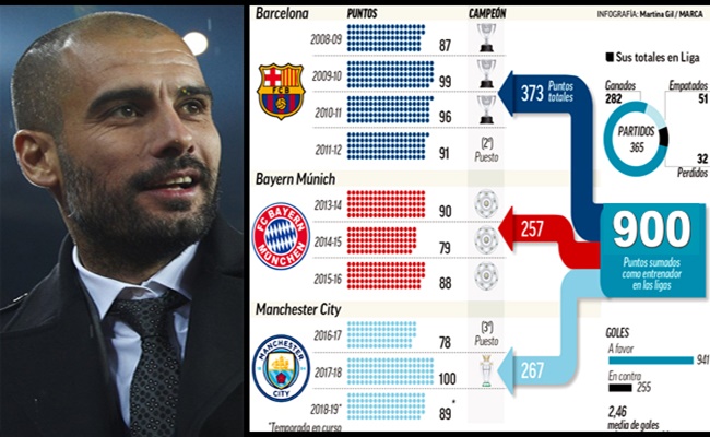 هذا واحتاج غوارديولا لجمع 897 نقطة من خلال تسجيل 941 هدفاً ، فيما استقبلت شباك الأندية الثلاثة التي دربها 255 هدفاً.