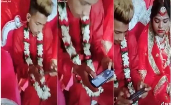 فقد قرر العريس، أن من الأفضل له أن يلعب لعبة القتال على هاتفه الذكي بدلا من متابعة ما يحدث أو على الأقل التواصل مع العروس الجالسة بجانبه.