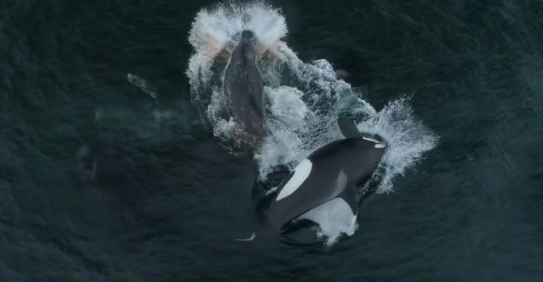 معركة فريدة من نوعها .. أنثى حوت رمادي تواجه عصابة من الحيتان و تستبسل في الدفاع عن وليدها ( فيديو )