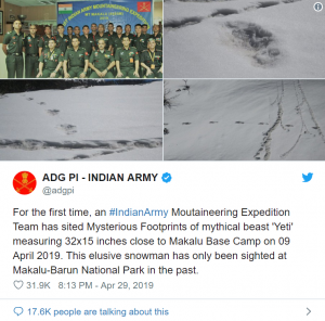 كما كشفت تغريدة الجيش الهندي الحجم المروع لآثار الأقدام، التي بلغ عرضها 81 سم وطولها 38 سم، ورصدت في تاريخ 9 أبريل الماضي، في الجزء النيبالي من جبال الهيمالايا.