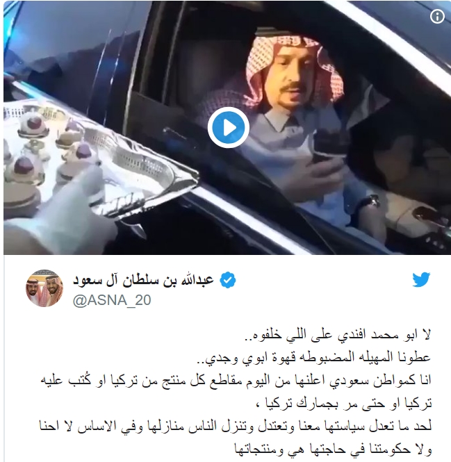 وأرفق الأمير في التغريدة مقطع فيديو رجح البعض أنه “لأحد الأمراء البارزين في المملكة” داخل سيارة، حيث يقدم له أحدهم كوبا من القهوة وعند سؤاله عن القهوة، قيل له إنها قهوة تركية فأعاد الكوب ولم يشربه.