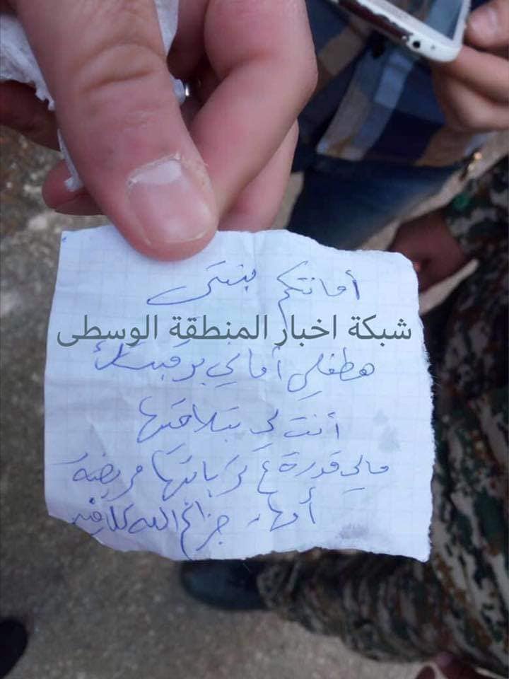 وقالت مصادر إعلامية موالية، إن الطفلة عثر معها على رسالة نصها: “أمانتكم بنتي، هالطفلة أمانة برقبتكم، أنت يلي بتلاقيها ما لي قدرة على تربايتها، مريضة أمها، جزاكم الله كل خير”.