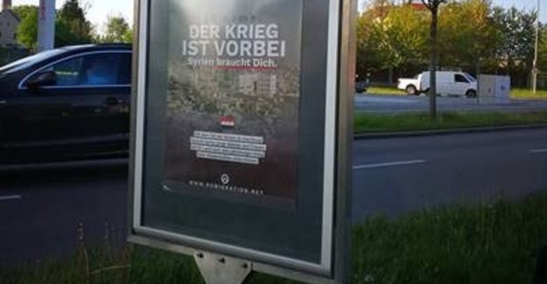 وقالت صحيفة “أوغسبورغر آلغيماينه“، الثلاثاء، بحسب ما ترجم عكس السير، إن “حركة الهوية” علقت ملصقات “إعلانية” تدعو اللاجئين السوريين إلى العودة إلى وطنهم.