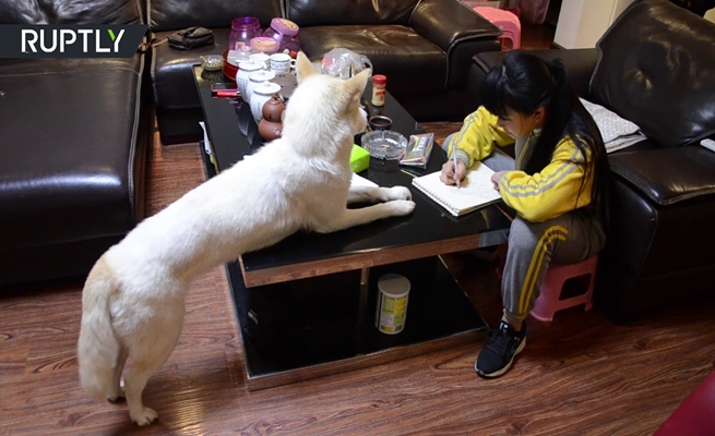 قام رجل صيني بتدريب كلبه على مراقبة ابنته للتأكد من أنها تؤدي واجباتها المدرسية.