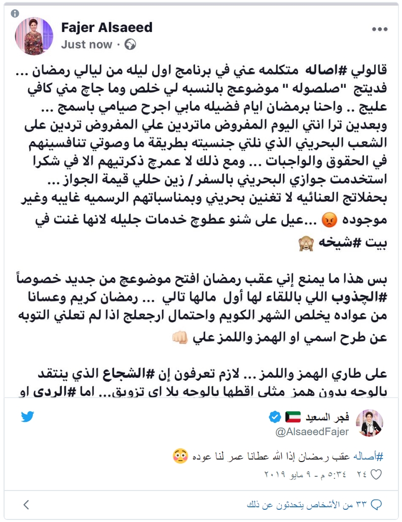 وتابعت: “بس هذا لا يمنع أنني عقب رمضان سأفتح موضوعك من جديد.. رمضان كريم وعسانا من عوادة.. بس يخلص الشهر الكريم وبرجعلك إذا لم تعلني التوبة عن طرح اسمي أو الهمز واللمز علي”.