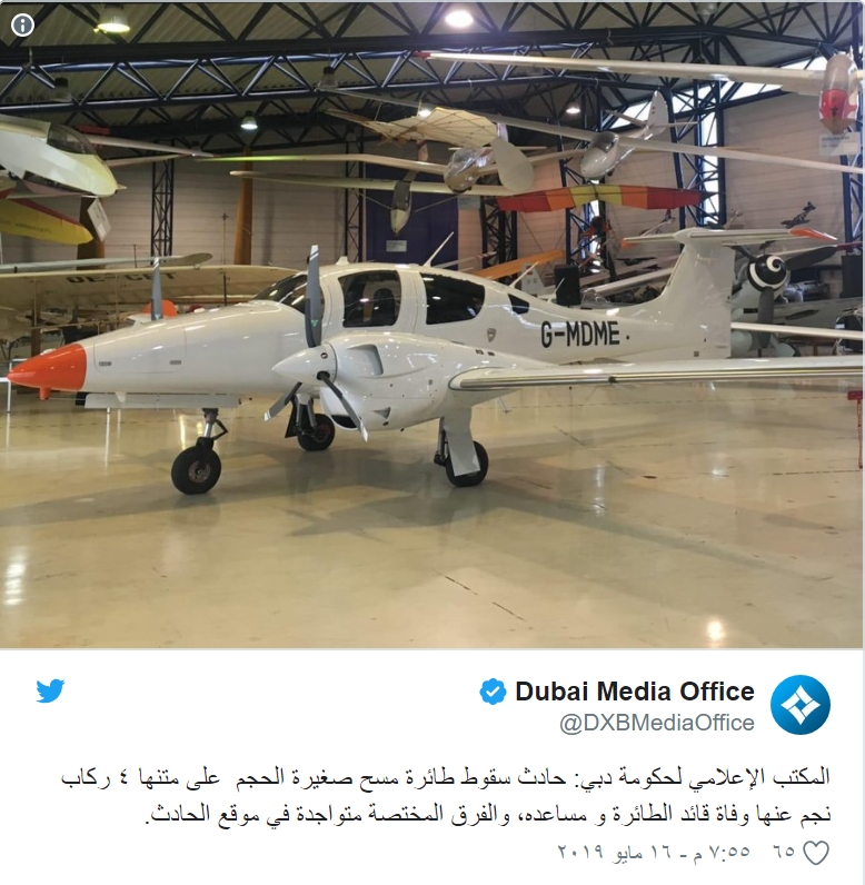 وأوضحت الهيئة الإماراتية أن الطائرة ذات أربع مقاعد من نوع DA42، تابعة للمملكة المتحدة، وكانت في مهمة لمعاينة أنظمة الملاحة الأرضية في مطار دبي.