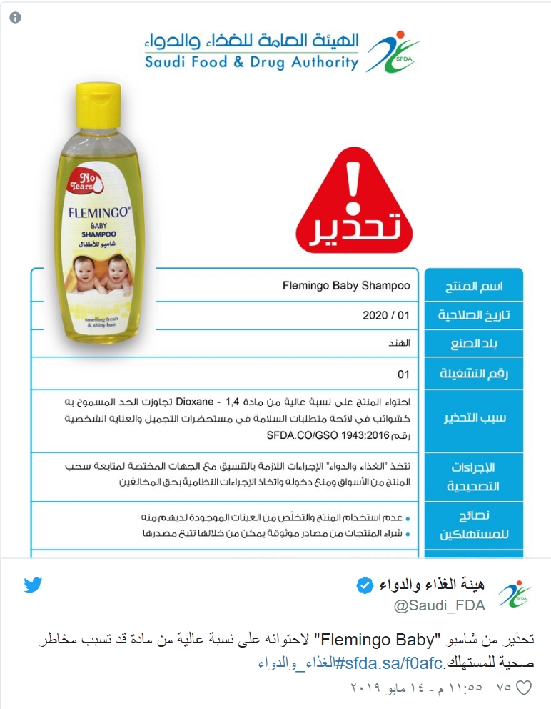 وأوضحت الهيئة إنها سحبت عينات من منتجات شامبو فليمنغو بيبي شامبو Flemingo Baby Shampoo المتداولة في الأسواق المحلية لتحليلها، وأظهرت النتائج احتواء المنتج المُصنع في الهند برقم تشغيلة 01 وتاريخ صلاحية 01/2020 على نسبة عالية من هذه المادة.