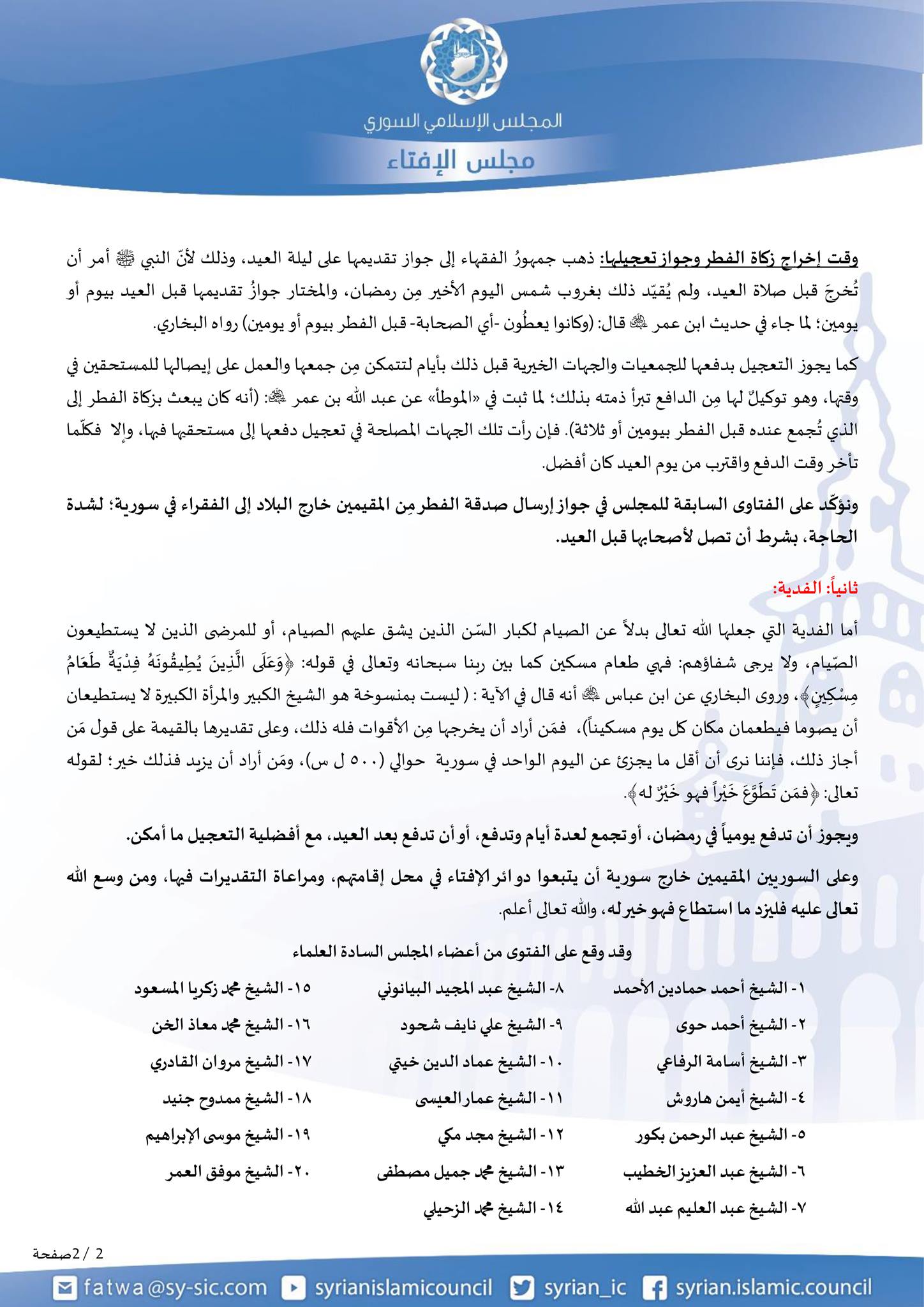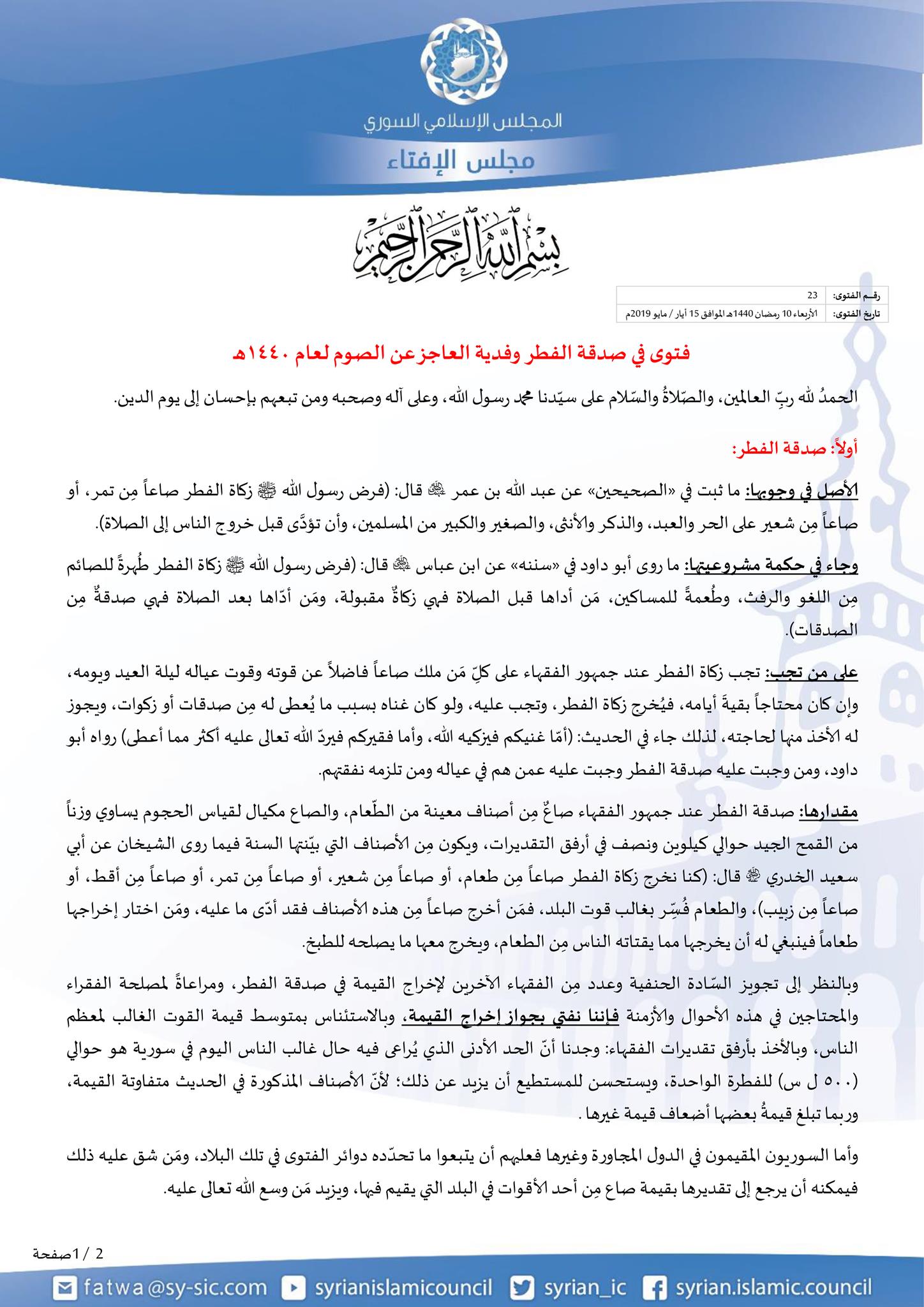 المجلس الإسلامي السوري : فتوى مجلس الإفتاء حول صدقة الفطر و فدية العاجز عن صوم رمضان
