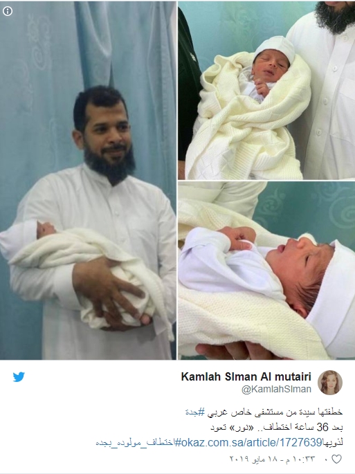 عثرت الأجهزة الأمنية السعودية على مولودة اخت. ـطفت من أحد مستشفيات جدة، بعد 36 ساعة على اختط. افها.