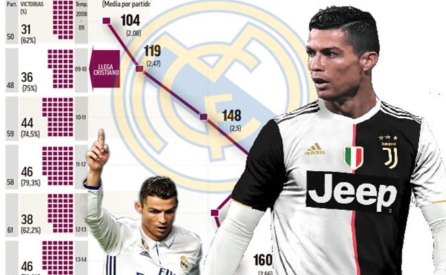 وتظهر الأرقام تراجعاً لافتاً في الأداء الهجومي لريال مدريد ، رغم إمتلاكه عدداً من الاسماء الكبيرة، كما تقلص مردود رونالدو التهديفي رغم انتقاله إلى نادٍ كبير بحجم يوفنتوس ينافس محلياً و قارياً، وهو ما يكشف الدور الإيجابي الذي ظل كل طرف يؤديه للآخر منذ ارتباطهما معاً في صيف عام 2009 ، بحسب صحيفة “إيلاف”، حيث ظل رونالدو ينافس بقوة على جائزة “الحذاء الذهبي” التي أحرزها ثلاث مرات كأفضل هداف في أوروبا .