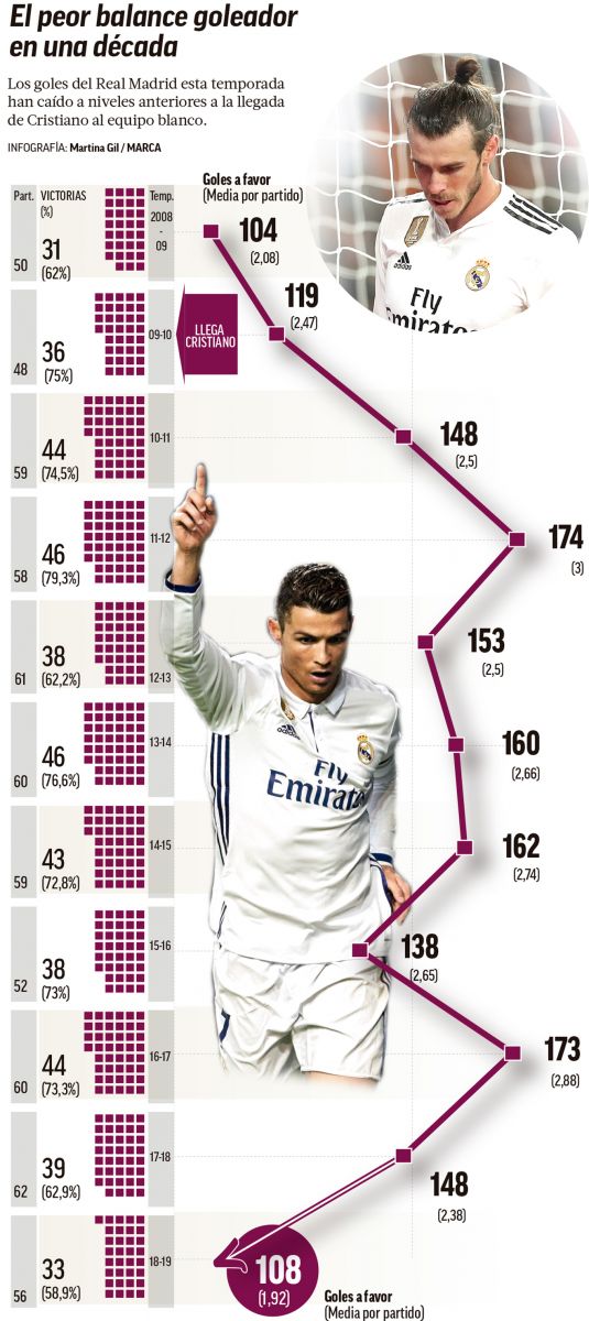 ويكشف تقرير صحيفة “ماركا” الإسبانية عن الأداء الهجومي الهزيل الذي ظهر عليه ريال مدريد خلال الموسم الجاري (2018-2019) ، وهو أول موسم يخوضه بدون رونالدو منذ عام 2009 ، حيث تراجع رصيد الفريق التهديفي بشكل واضح للعيان ، مما يؤكد الفراغ الرهيب الذي تركه الهداف التاريخي على خط الهجوم.