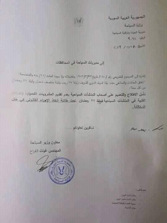 ويطلب التعميم من أصحاب المنشآت السياحية عدم تقديم المشروبات والبرامج الفنية ليلة 27 رمضان، “تحت طائلة اتخاذ الإجراء القانوني في حال المخالفة”.