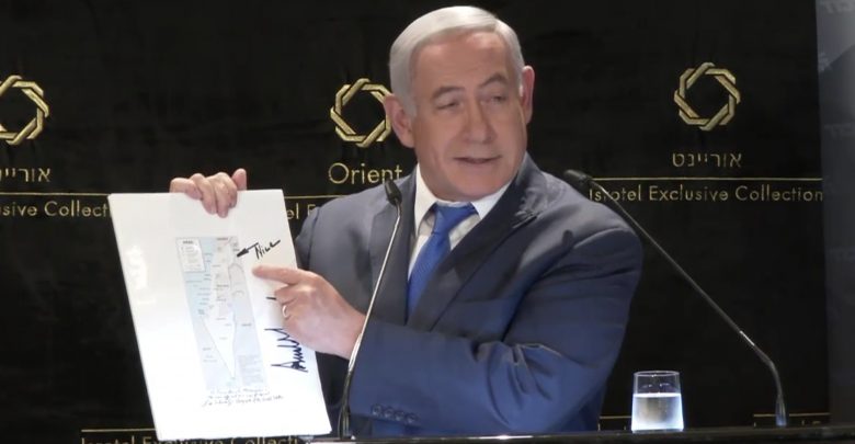 حمل نتنياهو خريطة لإسرائيل تضم مرتفعات الجولان موقعة من الرئيس الأمريكي دونالد ترامب.