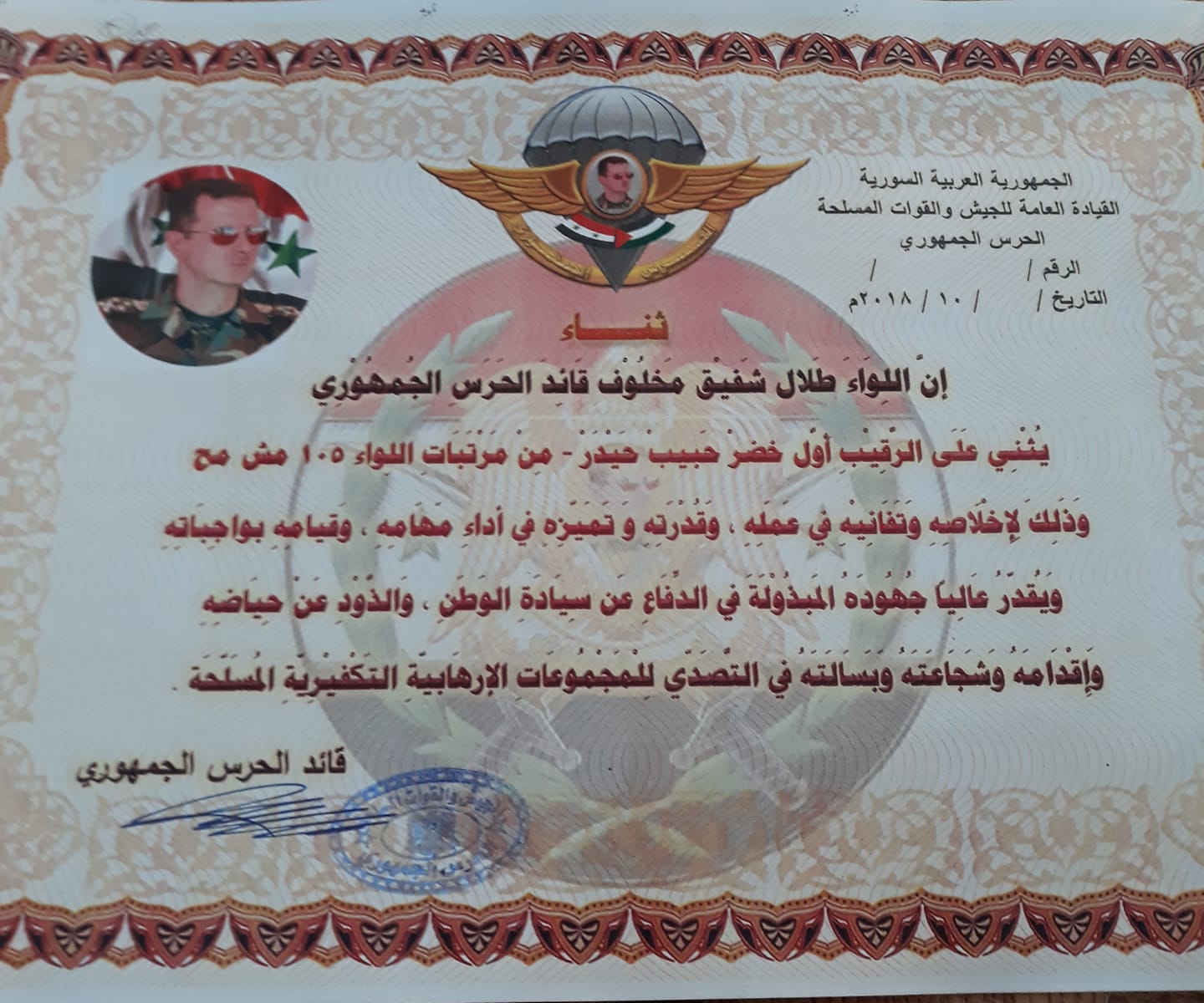 ومنح الثناء لحبيب من قبل اللواء طلال شفيق مخلوف، قائد الحرس الجمهوري، وذكر فيه أن حبيب ناله لـ “إخلاصه وتفانيه وتميزه”.