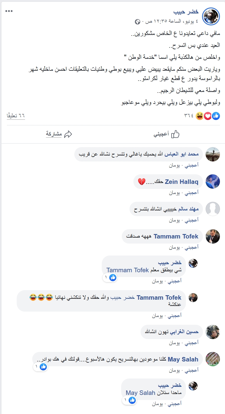 وقال خضر حبيب، وهو رقيب أول في الحرس الجمهوري، يحظى بمتابعة من قبل عدد كبير من الموالين، عبر حسابه الشخصي في فيسبوك: “مافي داعي تعايدونا ع الخاص مشكورين.. العيد عندي بس اتسرح.. واخلص من هالكذبة يلي اسما خدمة الوطن”.