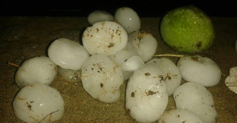 ونشر الإعلام الموالي صوراً قال إنها للحبات البريدة التي هطلت وتسببت بالأضرار.