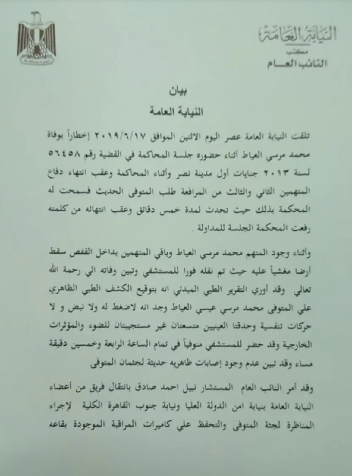 أصدر النائب العام في مصر بياناً حول وفاة محمد مرسي أثناء حضوره جلسة المحاكمة.