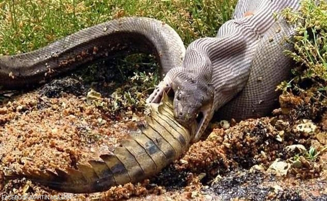 أفعى تبتلع تمساحاً ضخماً بطريقة مذهلة !