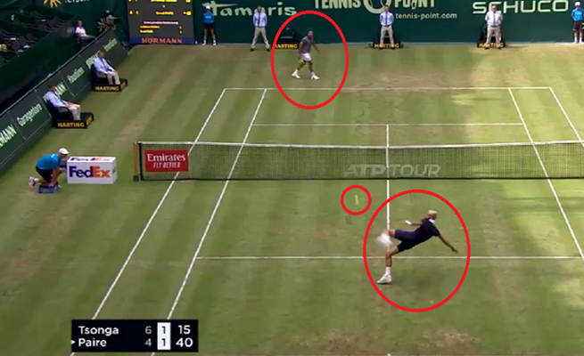 وأثناء قيام بير بالإرسال في الشوط الثالث من المجموعة الثانية، سقط المضرب من يده بعد أن أرسل الكرة باتجاه تسونغا الذي رد الكرة بمضربه إلى نصف الملعب المخصص لخصمه، ونتيجة لبعد المضرب عن بير واستسلامه لخسارة النقطة رد الكرة بقدمه باتجاه تسونغا الذي استغنى عن مضربه وبدأ بتداول الكرة مع خصمه بالقدمين في لقطة جميلة وسط تفاعل وتشجيع كبير من الجمهور.
