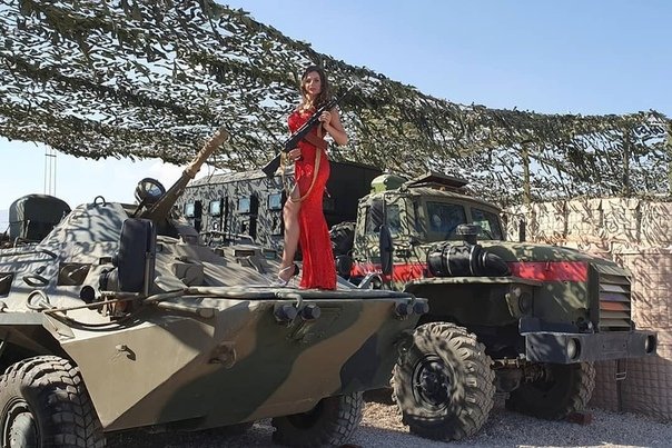 وأظهرت الصور التي نشرتها الوكالة مغنيات / فتيات روسيات وهن يغنين ويحملن السلاح والورود وهن واقفات فوق مدرعة.