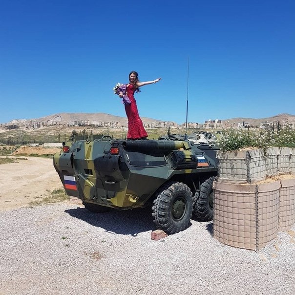 وأظهرت الصور التي نشرتها الوكالة مغنيات / فتيات روسيات وهن يغنين ويحملن السلاح والورود وهن واقفات فوق مدرعة.