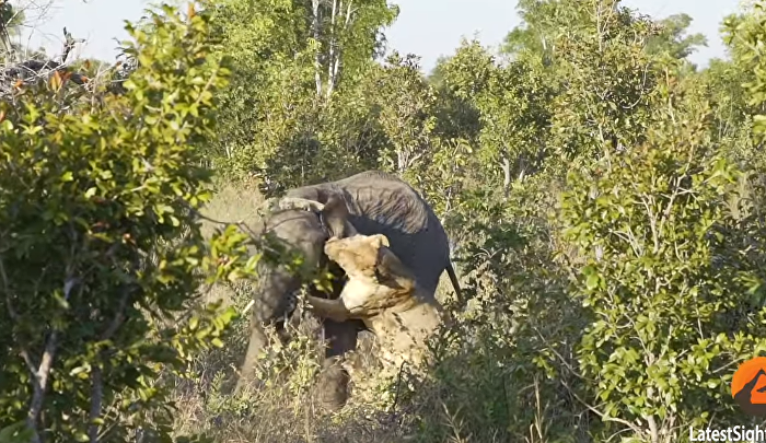 لبؤة جائعة تنقض على فيل و المعركة تنتهي بهزيمتها ( فيديو )