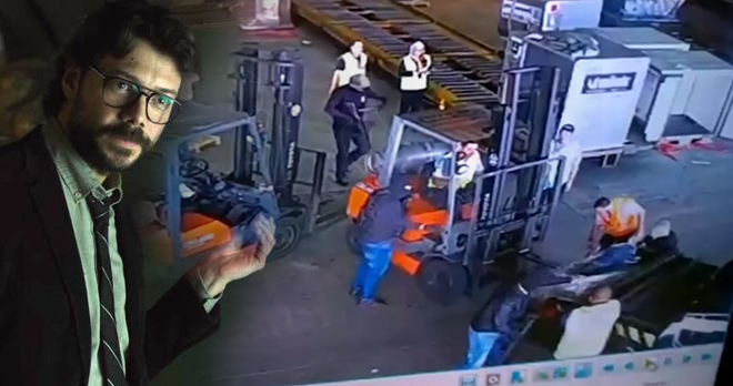 ثم أجبر المهاجمون المسلحون موظفي المطار على شحن ذهب على متن إحدى المركبات، باستخدام رافعة بضائع شوكية،على غرار ما يحدث في افلام السرقة من انتاج هوليوود.