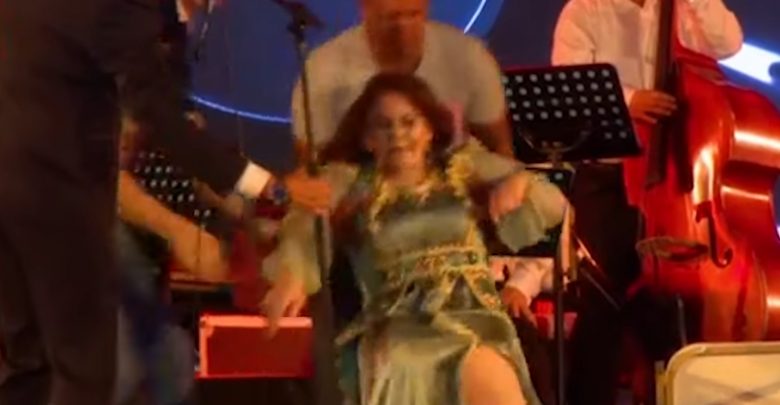 وكانت حناوي تغني قبل أن تفقد توازنها وتسقط، ليقوم مرافقوها بمساعدتها على النهوض مجدداً وإجلاسها على كرسي.