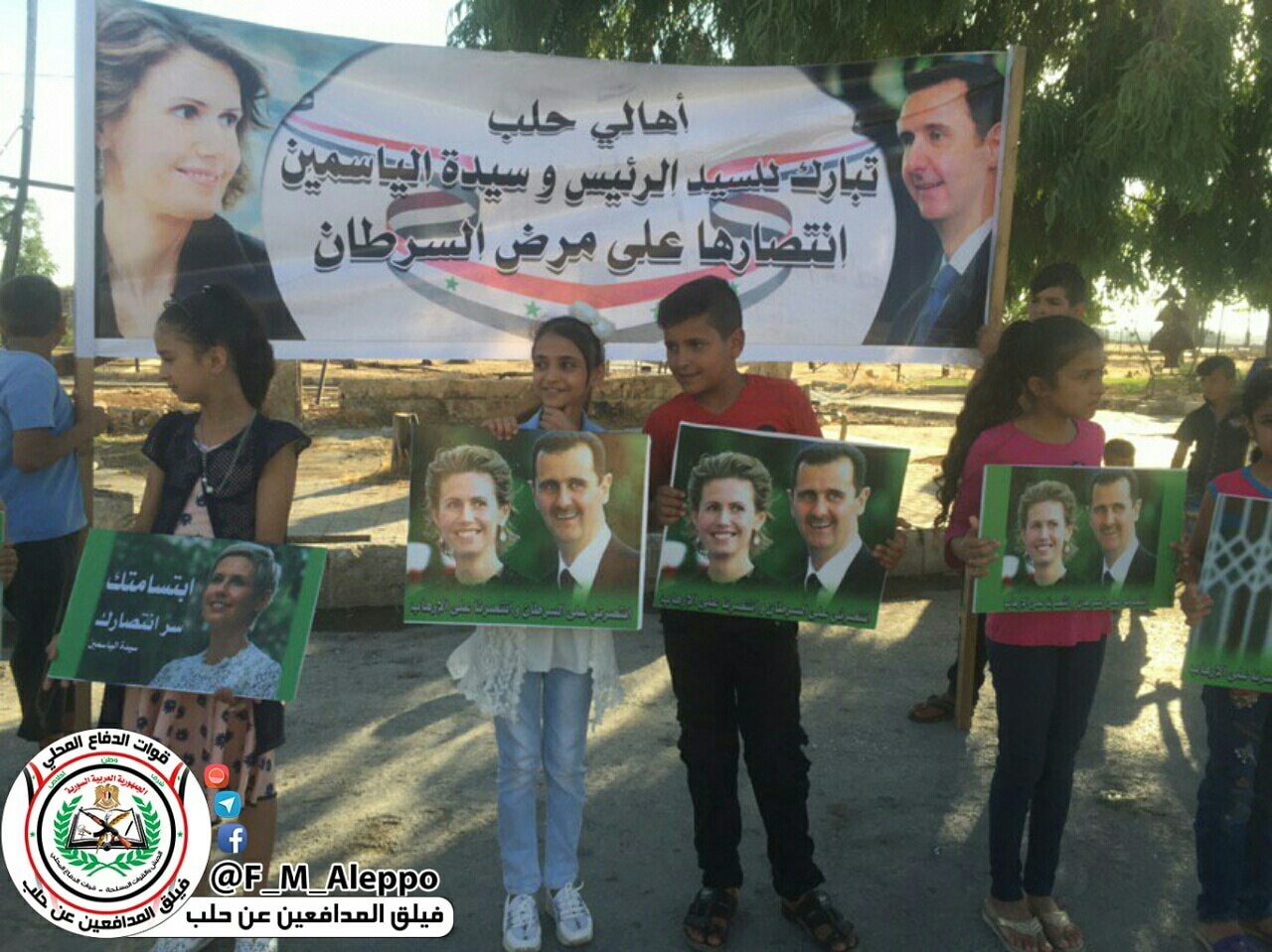 وأظهرت الصور أطفالاً يحملون لافتات تحتفي ببشار الذي انتصر على الإرهاب وزوجته التي انتصرت على السرطان، على حد زعم كاتبها.