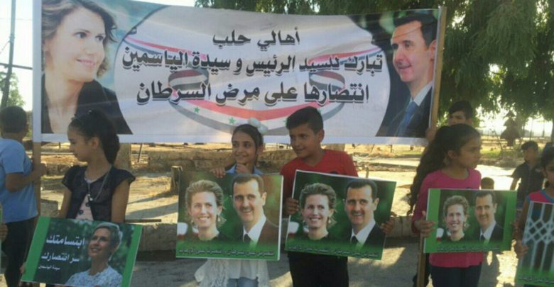 نشرت مصادر إعلامية موالية صوراً تظهر احتفال عدد من الموالين في حلب بـ “انتصار أسماء الأسد على السرطان”.