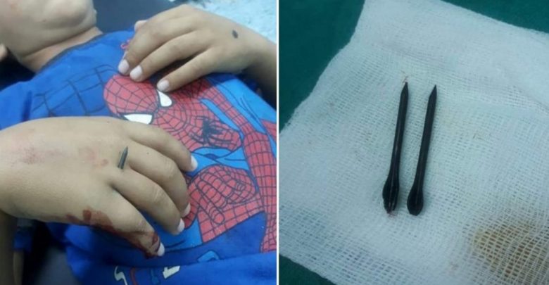 وقال الدفاع المدني عبر صفحته الرسمية: “الطفل مصطفى أصيب في بلدة حيش جراء غارة جوية لطيران الأسد الحربي من نوع لام 39 محملة بصواريخ مسمارية لتخترق جسده المسامير و هو يحاول مع عائلته الهروب من البلدة بعد غارات جوية مكثفة من الطيران الحربي يوم أمس”.