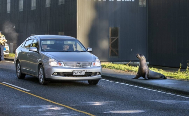 أسد بحر يبطئ حركة المرور في طريق سريع بنيوزيلندا