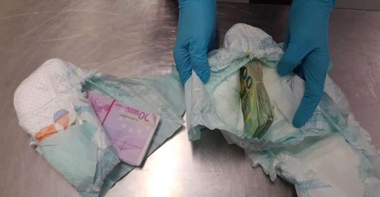 بيد أن الرجل البالغ من العمر 32 عاماً لم ينجح في مسعاه عندما أخضعه موظفو الجمارك للتفتيش، ليعثروا على المبلغ الكبير الذي كان مخبأً في الحفاضتين، بالإضافة إلى مبلغ 8 آلاف يورو كانت مخبأة في مكان آخر.