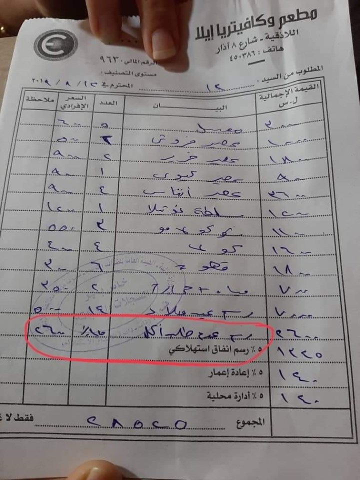 حقق أحد مطاعم اللاذقية شهرة واسعة بعدما نشرت “فاتورة”، طالب من خلالها المطعم أحد الزبائن بدفع مبلغ لأنه لم يطلب الطعام، تحت بند “رسم عدم طلب الأكل”.