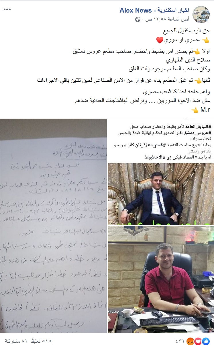 أكد المواطن السوري صلاح الطهاوي صاحب أحد مطاعم الإسكندرية، أنه “يكن كل الود والاحترام للشعب المصري”، منددا بفيديو انتشر على مواقع التواصل استغله البعض للتشهير به.