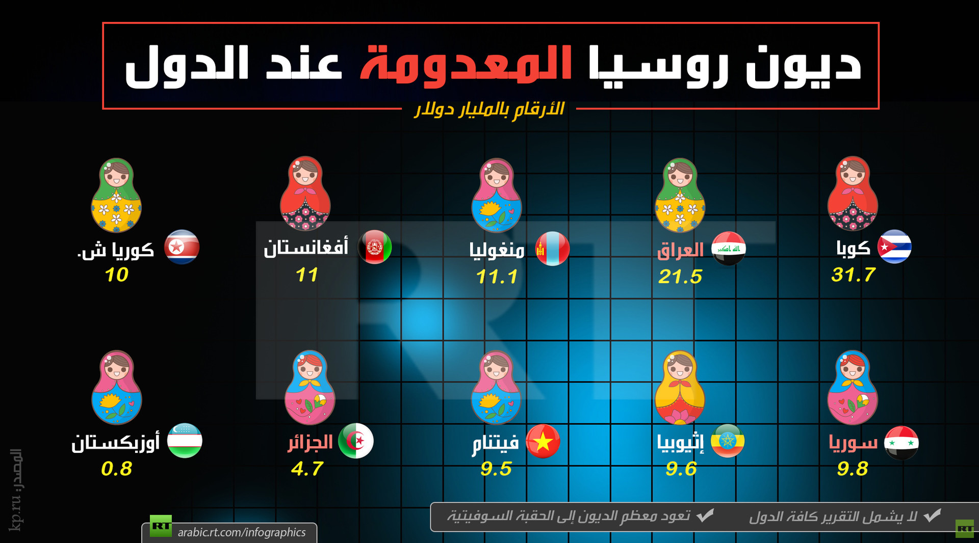 وأعدت صحيفة RBC الروسية تقريرا استند لعدة مصادر حول الدول المدينة لروسيا، ووفقا لها فإن 17 دولة في العالم مدينة لموسكو بـ26.7 مليار دولار.