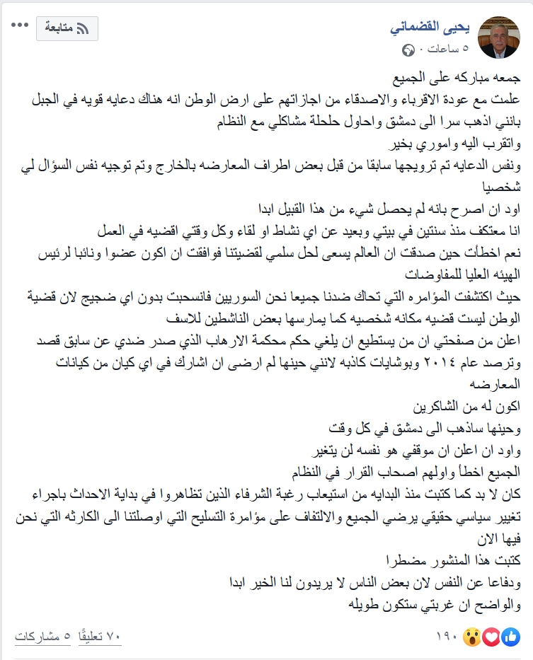 وأضاف: “اعلن من صفحتي ان من يستطيع ان يلغي حكم محكمة الارهاب الذي صدر ضدي عن سابق قصد وترصد عام ٢٠١٤ وبوشايات كاذبه لانني حينها لم ارضى ان اشارك في اي كيان من كيانات المعارضه اكون له من الشاكرين وحينها ساذهب الى دمشق في كل وقت”.