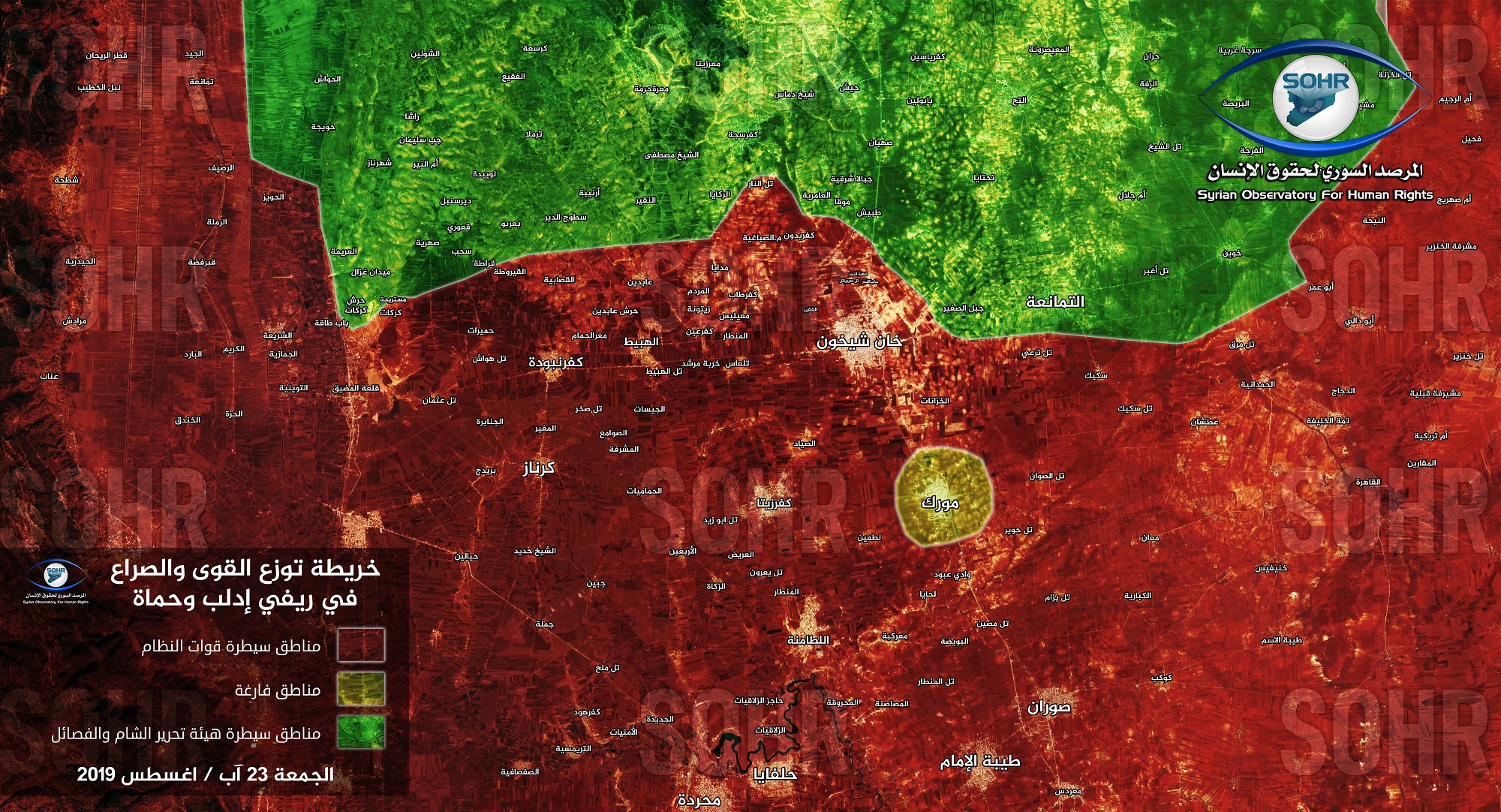 قال المرصد السوري لحقوق الإنسان، إنه رصد “استمرار توغل قوات النظام ضمن البلدات والقرى التي تحاصرها في ريف حماة الشمالي، حيث أن قوات النظام فرضت سيطرتها على بلدة اللطامنة وقرى الصياد والبويضة ومعركبة ولطمين ولحايا وتلال أخرى في محيطة المنطقة، وذلك بعد أن فرضت سيطرتها على كفرزيتا صباح اليوم”.