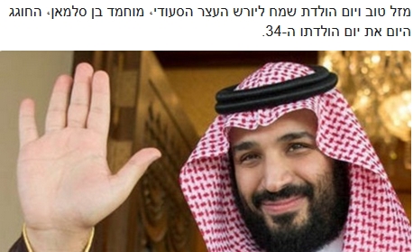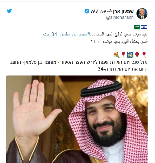 ونشر الصحفي الإسرائيلي شمعون آران، تغريدة قال فيها: “عيد ميلاد سعيد لولي العهد السعودي الذي يحتفل اليوم بعيد ميلاده الـ34”.